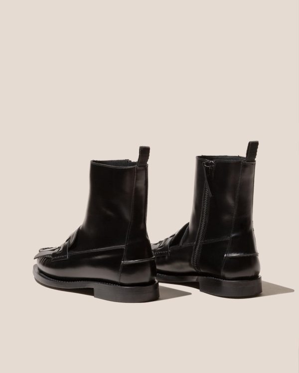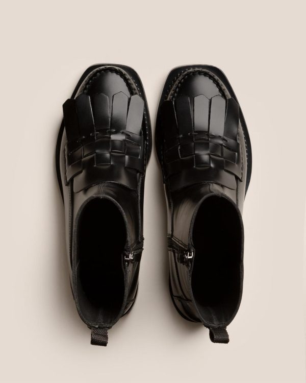 Mid-calf zipped boot with interwoven fringes front detail, crafted in structured calf leather. Made in Spain, by local artisans using local materials, celebrating excellence in craftsmanship.