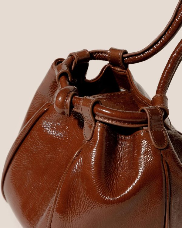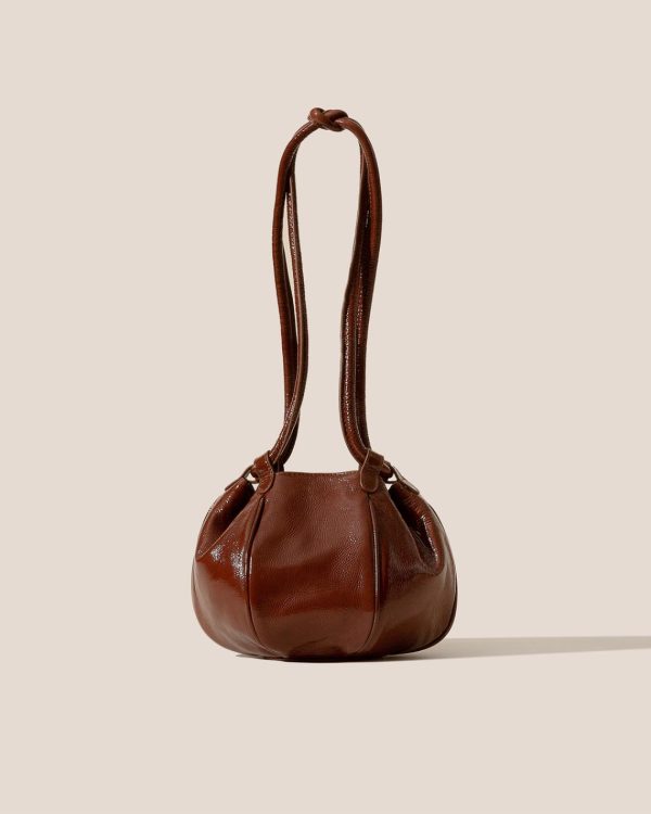 Balloon-shaped drawstring crossbody/tote mini bag crafted in crinkled patent Italian lambskin and lined with organic cotton canvas. It can be worn as a crossbody by pulling the strap to one side, or as as tote by pulling the straps evenly to both sides. Made in Spain by uniquely talented artisans, celebrating excellenc
