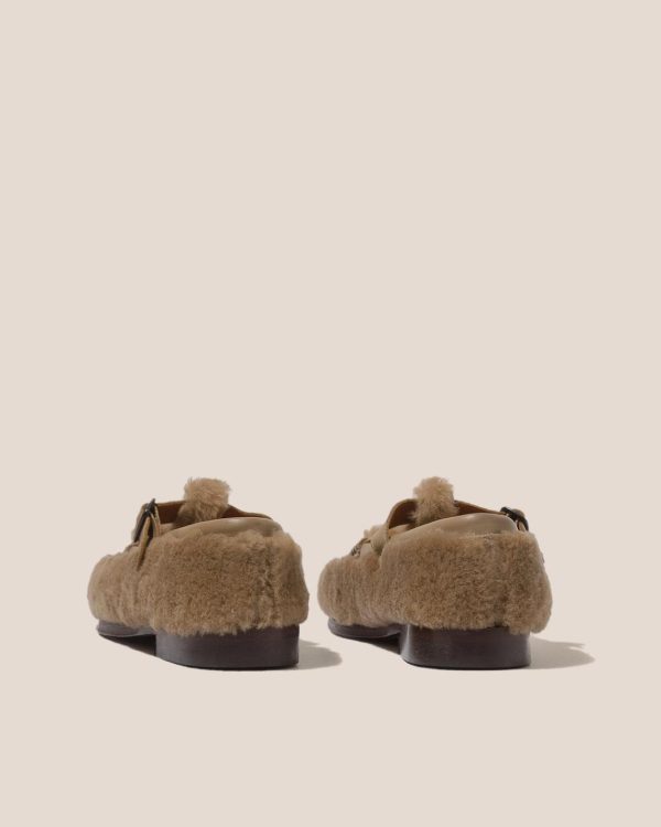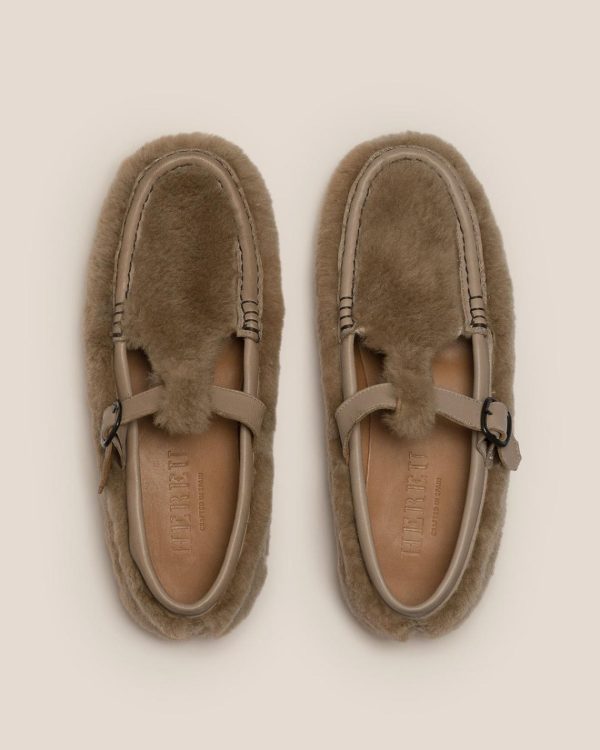 T-bar loafer crafted in light tan shearling with smooth leather trims. Handsewn using the traditional moccasin construction. Made in Spain, by local artisans using local materials, celebrating excellence in craftsmanship.