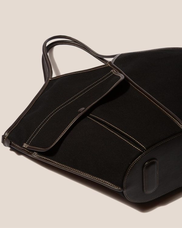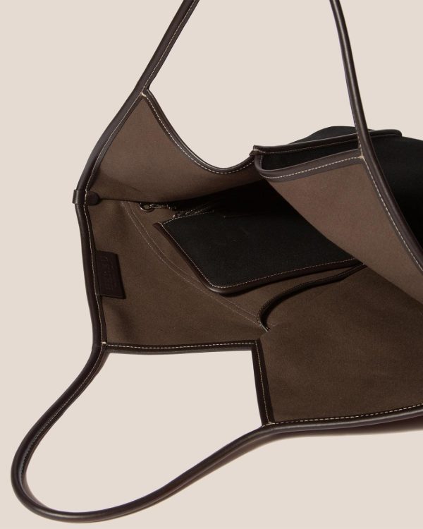 Side-pocket organic cotton tote bag edged with smooth leather. It has a zipped pouch to secure small essentials and slim top handles that sit over the shoulder. Handmade in Spain by uniquely talented artisans, celebrating excellence in craftsmanship.