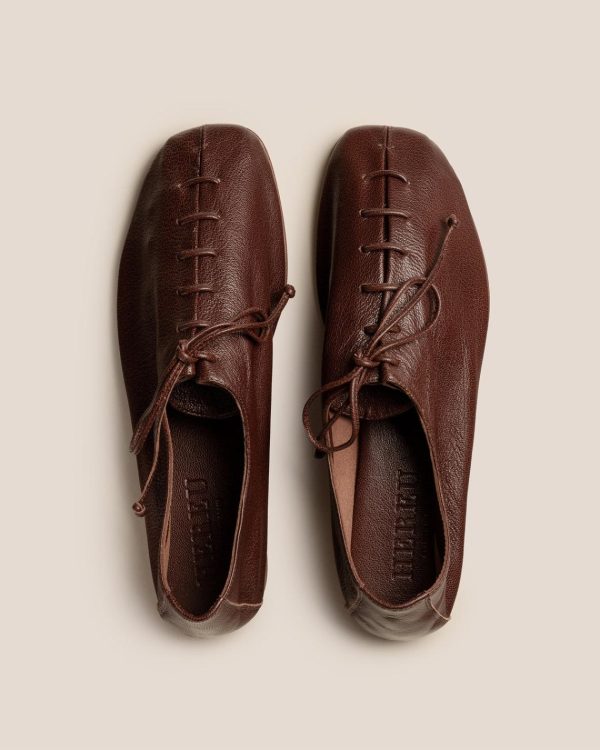 Round-toe flat lace-up shoe with bellows tongue (one piece), crafted in unlined supple shiny lambskin with matching leather laces. Made in Spain by uniquely talented artisans, celebrating excellence in craftsmanship.